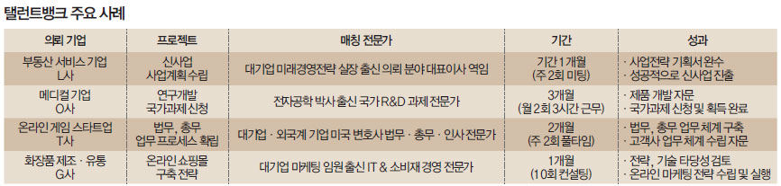 의뢰 기업들의 규모를 살펴보면, 중소기업(54%), 스타트업(26%), 중견기업(16%), 대기업(2%), 공공기관(2%) 순으로, 전문 인력 수급이 어려운 중소 규모 기업에서 많이 찾고 있는 것으로 나타났다.탤런트뱅크에 등록된 인력은 약 1만여 명으로 모두 중소기업 임원 또는 대기업 팀장 이상을 경험한 평균 경력 15년 이상의 베테랑들이다.